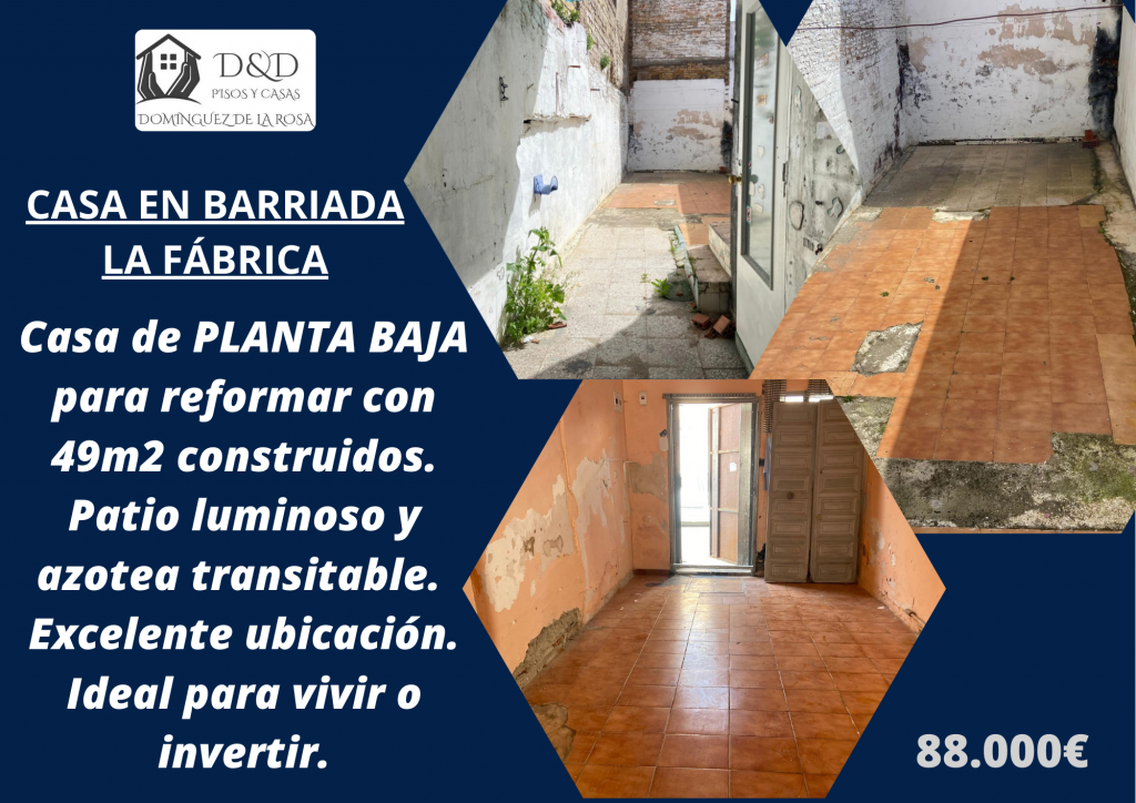 Casa en Barriada de la Fábrica – 49 m² para reformar con patio y azotea Se vende vivienda en planta baja situada en la Barriada de la Fábrica. La casa cuenta con 49 m² construidos, ideal para reformar y adaptar completamente a tu gusto. La vivienda dispone de: ✔️...
